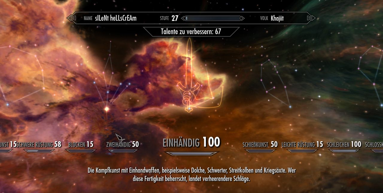 Wie ihr hier sehen könnt habe ich ein "Einhändig" Skill von den maximalen 100 Punkten. Etwas weiter rechts im Bild seht ihr auch das dass "Schleichen" Talent ebenfalls auf 100 steht.
