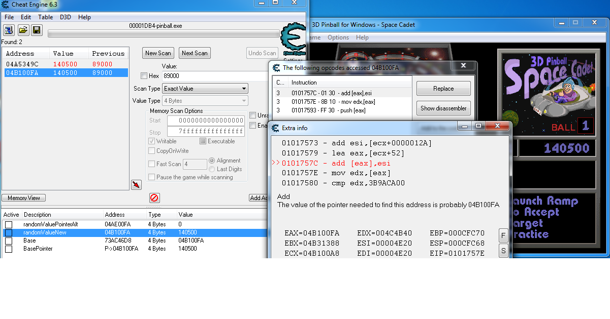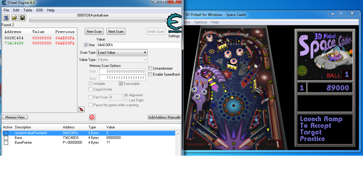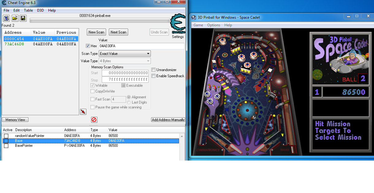 ) und trage einfach nur oben genannte Adresse ein. Wie gesagt, wenn ich pinball neustarte zeigt er mir als value erstmal "??" an. Nach einer zufälligen Zeit hat er dann auf einmal die richtige Value und ich kann diese auch ändern. BTW wenn ich maunell erneut nach dem BasePointer suche kommt immer wieder die o.A adresse heraus. Diese ist auch immer grün markiert.