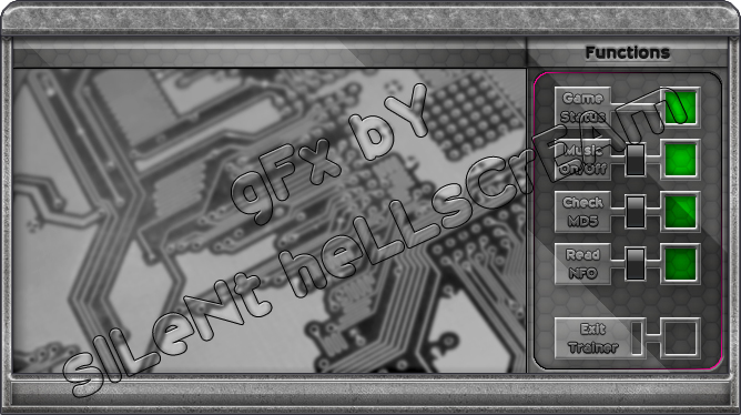 Da ich ja nun mittlerweile meine Trainer Templates wieder zurückportiere auf die neueste Version der IDE, hab ich mich entschieden glei noch nen neues Design zu machen... Handelt sich dabei um nen komplettes ReDesign, soll heißen das die Funktionen bzw. die Buttons allesamt auf der rechten Seite zu finden sind. Links davon kommen die ganzen Infos hin. Also NFO und die Sache mit dem MD5 Check. Wobei ich mir bei dem MD5 Check Fenster/Frame, wie auch immer ich das löse, noch nicht ganz sicher bin...