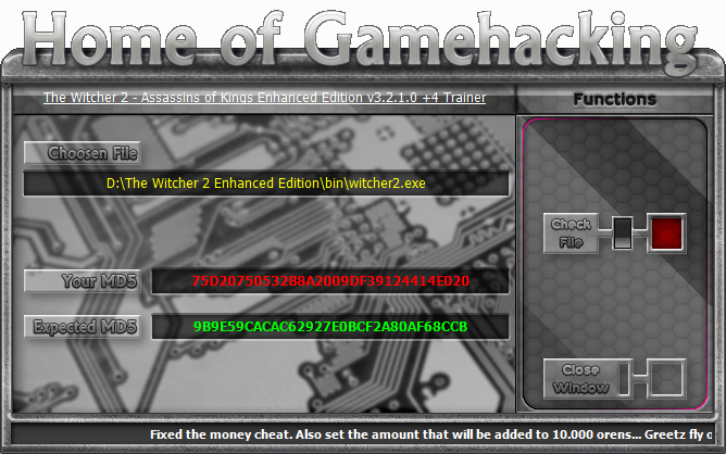 Hab das Spiel einfach mal von der Platte geschmissen und neu installiert. Im nachfolgenden Screenshot seht ihr den MD5 Hash zur "witcher2.exe".