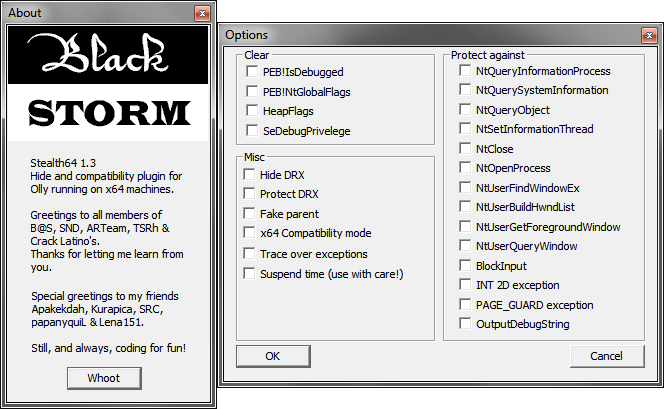 Und zuguterletzt hätten wir da noch das Stealth64 Plugin, welches mit seiner Option "x64 Combatibility mode" den Olly Debugger auch auf 64-Bit Systemen zum laufen bringt.